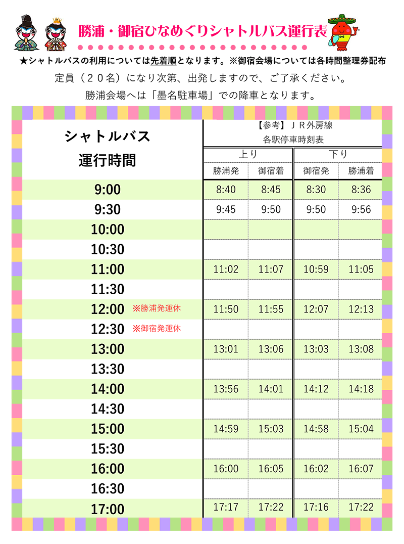 おんじゅくまちかどつるし雛めぐり(御宿町)とかつうらビッグひな祭り(勝浦市)の会場を結ぶシャトルバスの運行やスタンプラリーを開催いたします。