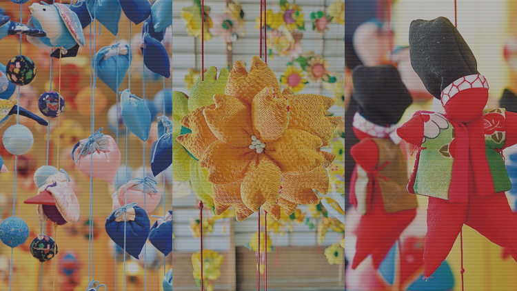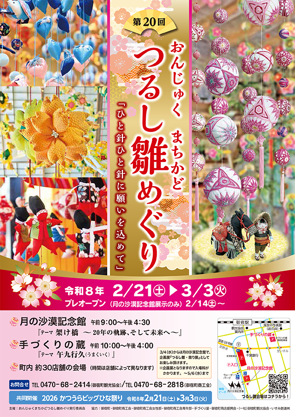 人や物に対する優しさや思いやりを育む日本の代表的な行事である雛祭りに取り組み、子供達の健やかな成長を願うと共に、それをご覧になった方々が元気になることを、ひと針ひと針に願いを込めて作ったつるし飾りが、メイン会場の「月の沙漠記念館」や「手づくりの蔵」の他、御宿町内のお店などに飾られます。
